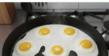 At first glance, the image looks simple: a frying pan filled with sunny-side-up eggs arranged in a playful pattern. But…